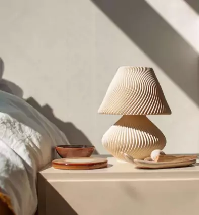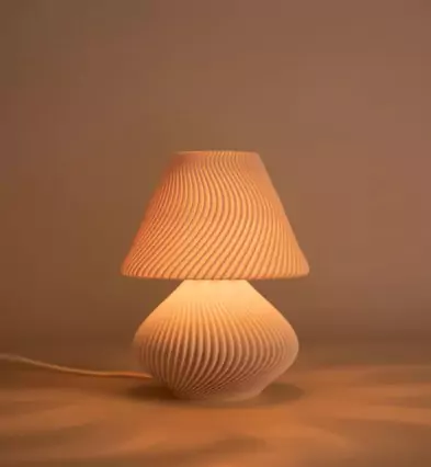 The 3D-printed mushroom-inspired lamp brings soft, warm illumination to any space. Measuring 225 mm high and 160 mm wide, it’s made from eco-friendly recycled materials and fits perfectly on a bedside table, reading nook, or small desk. Its neutral beige tone and organic texture complement Japandi, Scandinavian, or modern minimalist interiors, offering cozy, ambient lighting for mindful living.