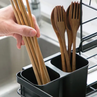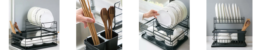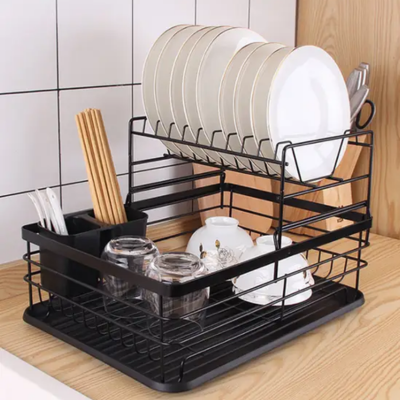 Maintain a tidy and efficient kitchen with this 2-tier dish drainer. Its detachable drip tray and utensil containers make washing and drying dishes easy and organized. The sturdy black-coated metal frame holds plates, glasses, and cutlery securely, making your kitchen reset a breeze and leaving your countertop clutter-free.